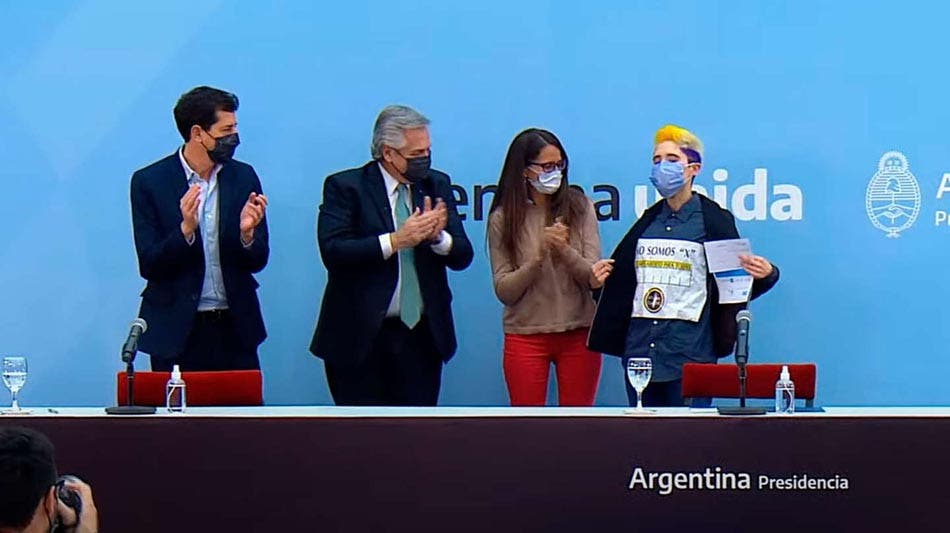 El presidente, junto a la ministra Elizabeth Gómez Alcorta y el ministro Eduardo “Wado” De Pedro, encabezaron la entrega de los primeros documentos para personas que no se autoperciben como femenino ni como masculino.