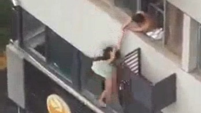 En el video capturado desde un edifico en frente del escenario del siniestro, se ve a una mujer colgando de la ventana de un departamento, con un hombre semidesnudo intentando detenerla antes de que salte.