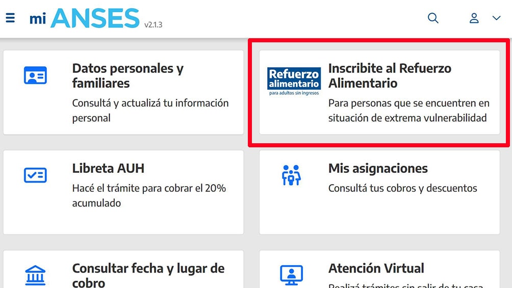 1) Entrar a la página oficial anses.gob.ar y seleccionar en el inicio “Refuerzo Alimentario”. Luego, elegir la opción “inscribite”. También pueden ingresar directamente a la aplicación Mi ANSES.