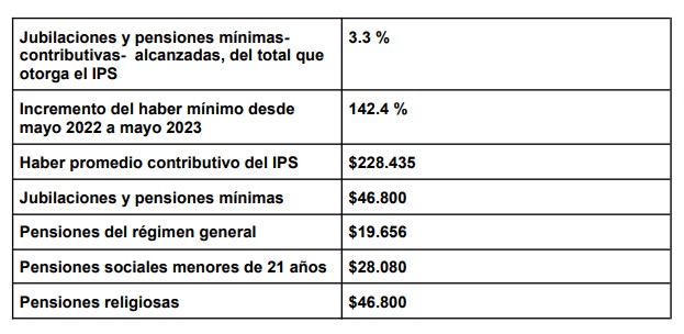 Cabe consignar que las jubilaciones y pensiones mínimas representan el 3,3 % del total de los beneficios que abona mensualmente el IPS. En el último año, el incremento de los haberes mínimos alcanzó el 142,4%. Actualmente, el haber promedio contributivo de beneficiarios del IPS es de $228.435.
