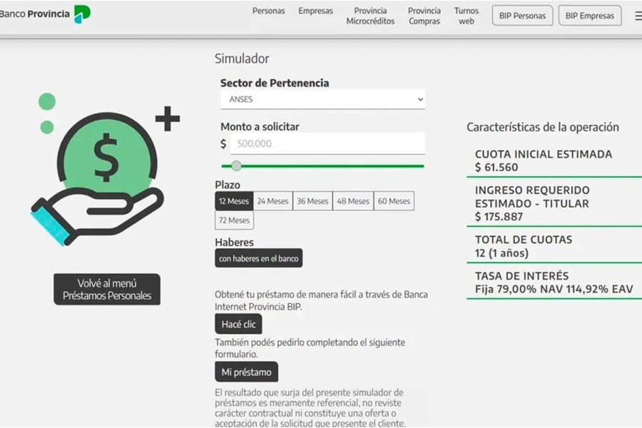 El Banco Provincia ofrece un simulador online que calcula el monto del crédito, el valor de la cuota y los requisitos según el ingreso del solicitante. Por ejemplo, un préstamo de $1.700.000 a 36 cuotas tiene una cuota inicial estimada de $124.454, con un ingreso mínimo exigido de $355.582. La tasa nominal anual es del 79% y el Costo Financiero Total Efectivo Anual (CFTEA) llega al 114,92%.