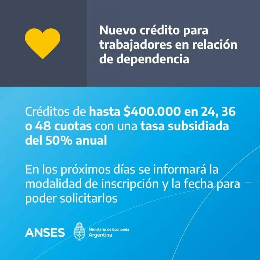 Desde el organismo que conduce Fernanda Raverta, anunciaron: “Créditos de hasta $400.000 en 24, 36 y 48 cuotas con una tasa subsidiada del 50% anual”. No obstante, aún no se dieron más precisiones al respecto: