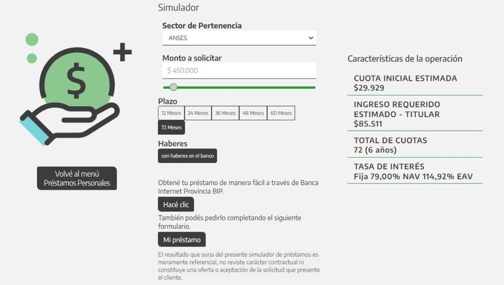 • Préstamos Exprés: contempla préstamos de hasta 1.2 millones de pesos, con un interés anual del 49% y hasta 36 meses para pagar. La cuota fija equivale a $5.350 por cada $100.000 otorgados. Esta alternativa está disponible únicamente para jubilados que cobran en Banco Provincia, con posibilidad de tramitarlo online o presencialmente, obteniendo el dinero al instante.