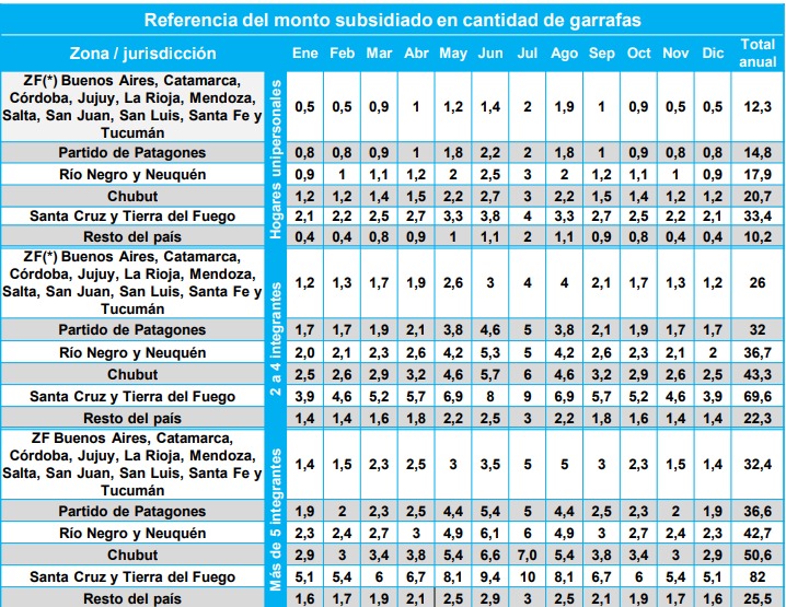 Existen zonas frías más claras, como puede ser Tierra del Fuego, Santa Cruz, entre otros. En otros lugares no se considera la provincia completa, sino determinados puntos, como puede ser Malargüe en Mendoza. En la siguiente tabla oficial se puede observar la cantidad de garrafas que corresponden por mes, por zona y por grupo familiar: