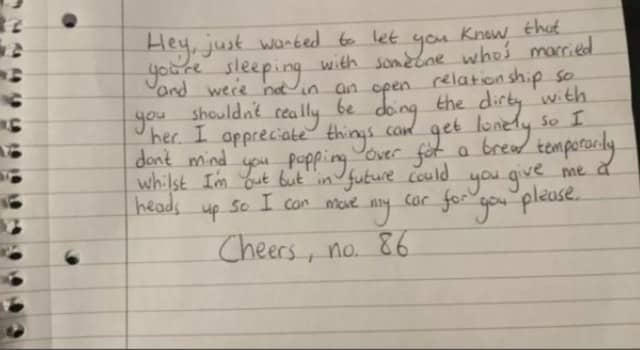 En las redes sociales se hacen virales diariamente diversas historias insólitas que viven los usuarios. En esta ocasión, un hombre, oriundo del Reino Unido, contó que llegó a su casa y vio a su mujer manteniendo relaciones sexuales con su amante en su propia cama. En lugar de realizar algún tipo de escena al respecto, sólo atinó a dejarle una inusual nota al otro tipo. Esa carta se volvió viral rápidamente en las redes.