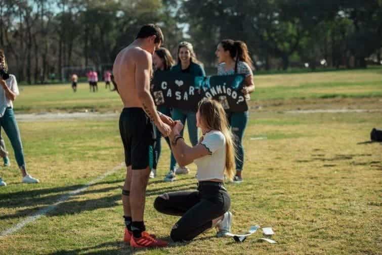 Rocío y Franco llevan en pareja unos seis meses, pero se conocieron hace 14 años. Decidida y con un poco de miedo a la respuesta, el último fin de semana, ella le propuso casamiento a él cuando terminó de jugar al fútbol. El episodio sucedió en la provincia de Santa Fe.