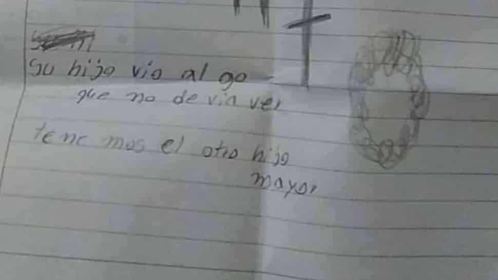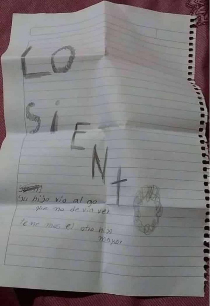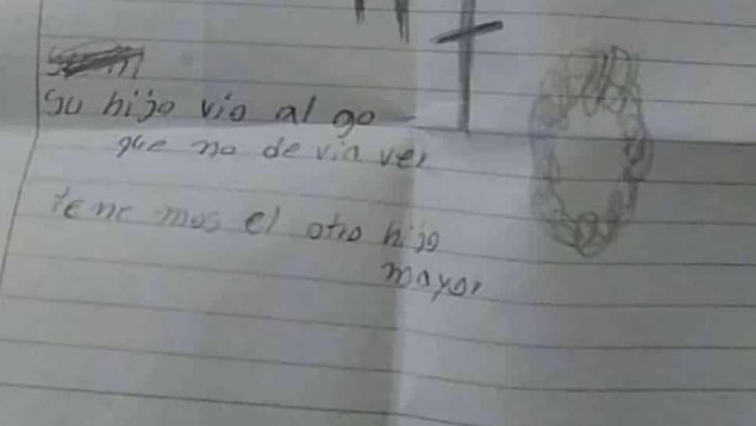 Para completar el tremendo cuadro, junto al cuerpo del niño habia una macabra nota escrita en una hoja de cuaderno colegial: “Lo siento, su hijo vio algo que no debía ver. Tenemos al otro hijo mayor”.