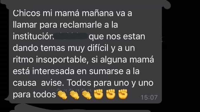 “Chicos, mañana mi mamá va a llamar para reclamarle a la institución que nos están dando temas muy difíciles a un ritmo insoportable. Si alguna mamá está interesada en sumarse a la causa, avise. Todos para uno y uno para todos”, escribió el joven estudiante en un chat de un grupo de WhatsApp.