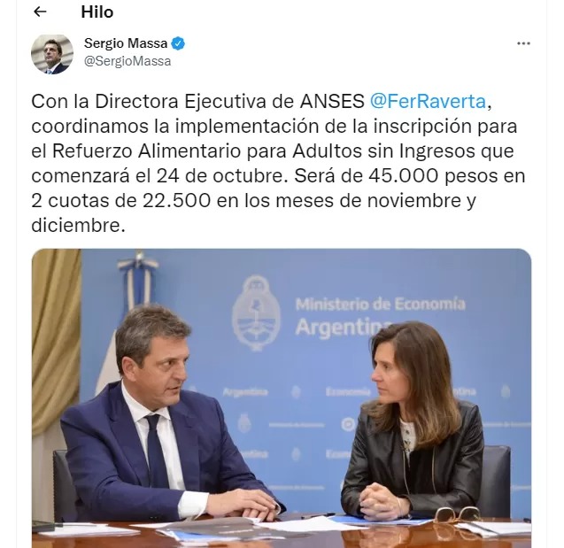 Este jueves, la directora ejecutiva de ANSES, Fernanda Raverta, se reunió con Sergio Massa, para coordinar la implementación del nuevo Refuerzo Alimentario que, según confirmó el ministro de economía a través de su cuenta de Twitter, será de $ 45.000 y se pagará en dos cuotas de $ 22.500 en noviembre y diciembre.
