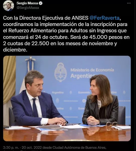 “Con la Directora Ejecutiva de ANSES, @FerRaverta, coordinamos la implementación de la inscripción para el Refuerzo Alimentario para Adultos sin Ingresos que comenzará el 24 de octubre. Será de 45.000 pesos en 2 cuotas de 22.500 en los meses de noviembre y diciembre”, publicó el titular del Palacio de Hacienda en su cuenta de Twitter.