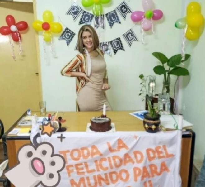 Llejos de enojarse, la profesional pidió que bajaran el carte y lo usó para decorar su mesa de cumpleaños durante el festejo que le realizaron en el trabajo.