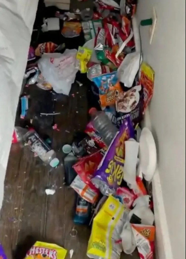 El video de TikTok muestra a Amanda entrando en la habitación del joven sorprendida, al contemplar el lado izquierdo de la cama. La cámara luego se desplaza hacia el suelo donde se ven decenas de envoltorios de golosinas y snacks, botellas de bebidas vacías, platos de papel y básicamente mucha basura.