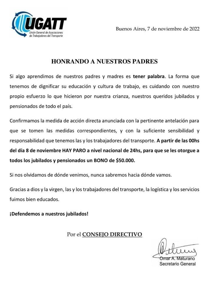 “Ante la vorágine devastadora de la inflación”, la UGATT había ratificado el paro y reclamó “para diciembre el pago de un bono de 50 mil pesos para los jubilados y pensionados y la eliminación de Ganancias”, sostuvo entonces.