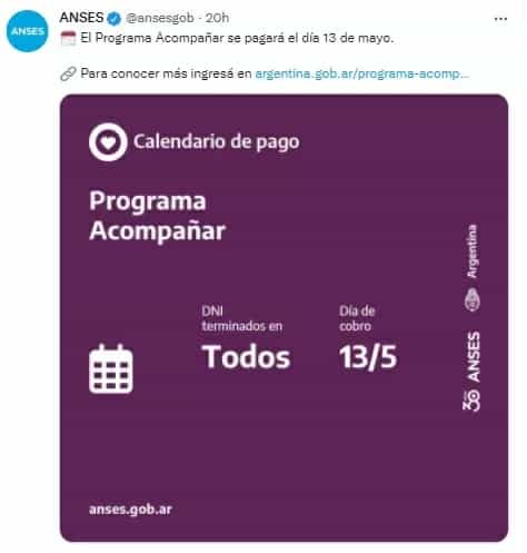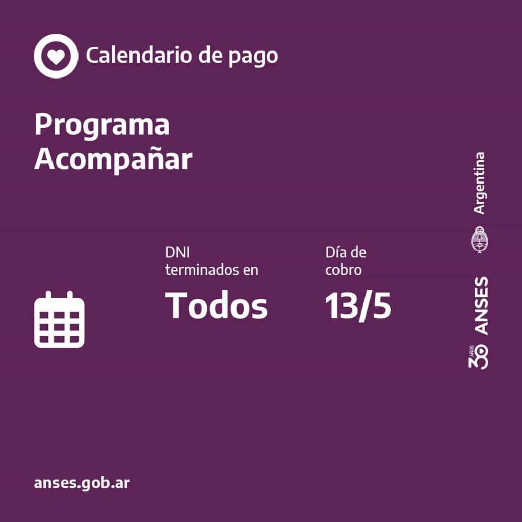 “El Programa Acompañar se pagará el día 13 de mayo”, informó el organismo conducido por Fernanda Raverta, en redes sociales.
