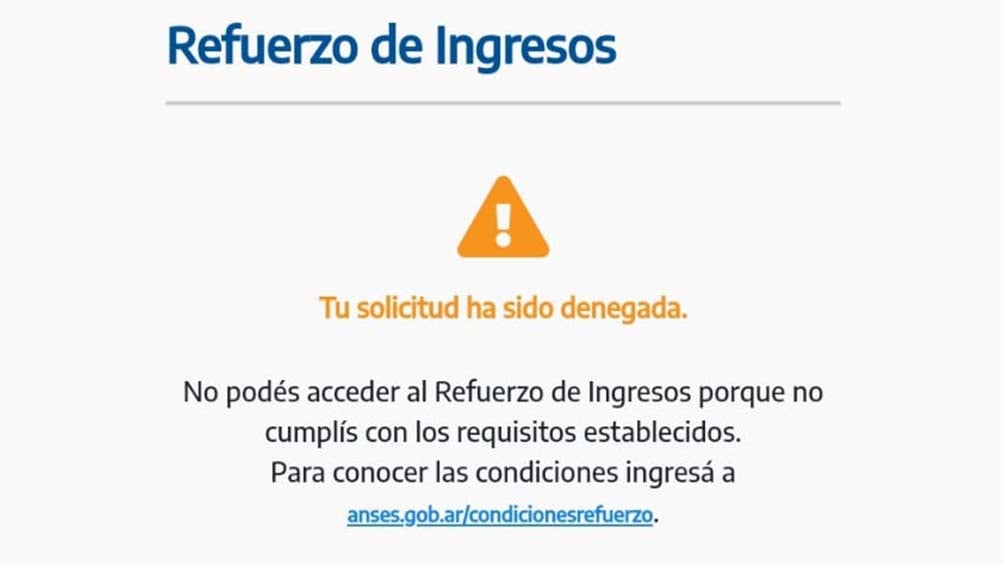 “Tu solicitud ha sido aprobada. Vas a cobrar el Refuerzo de Ingresos a partir del 19 de mayo según la terminación del DNI”, apunta el mensaje positivo. “No podés acceder al Refuerzo de Ingresos porque no cumplís con los requisitos establecidos”, detalla, por su parte, el texto negativo.