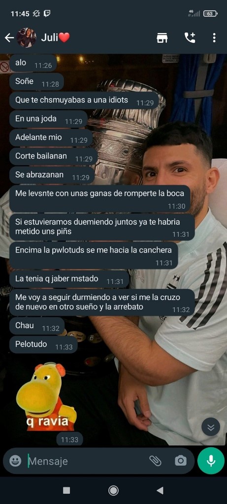 “Me voy a seguir durmiendo a ver si me la cruzo de nuevo en otro sueño y la arrebato. Chau pelot…”, escribió y cerró la conversación con un sticker que decía “Q Ravia”(sic).