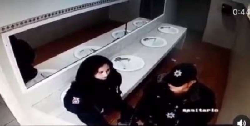 Una pareja de policías fue captada en un video, difundido en redes sociales, en el que se observa cómo, al ponerse románticos, rompieron el lavabo del baño en el que se encontraban.